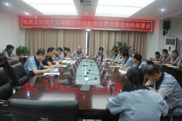 為深入貫徹中央全面從嚴治黨要求,落實中央八項規定精神,根據集團公司落實八項規定精神專項檢查情況通報會會議精神,結合公司實際,2018年8月9日,核昌公司于小會議室召開關于八項規...