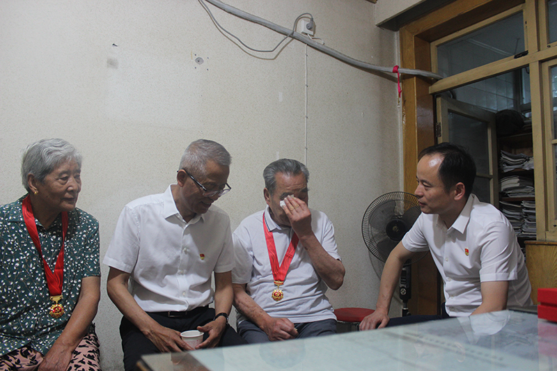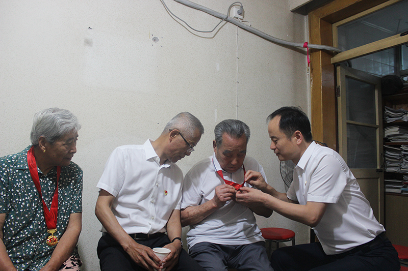 在小區(qū)離退辦,王建國詳細詢問了老人們的身體狀況、生活情況,囑咐老人要注意保重身體,并叮囑隨行人員一定要結(jié)合黨史學習教育,帶著感情、帶著責任幫助他們解決實際困難,落實好各項政策,照顧好日常生活,讓他們切實感受到組織的溫暖、幸福愉快地安享晚年。他為在黨50年的老黨員們親手佩戴了黨中央頒發(fā)的“光榮在黨50年”紀念章,并與部分老黨員進行了座談。佩戴上黨章的老黨員們熱淚盈眶,激動地唱起《沒有共產(chǎn)黨就沒有新中國》等革命歌曲,慷慨激昂的旋律,高亢熱情的聲音,彰顯了老一輩共產(chǎn)黨員初心不改的熱忱。大家紛紛表示深切感受到了以習近平同志為核心的黨中央的關(guān)懷和溫暖,要始終牢記黨的宗旨,聽黨話、感黨恩、跟黨走,力所能及地發(fā)揮老黨員的余熱,用實際行動為公司高質(zhì)量發(fā)展鼓勁加油。